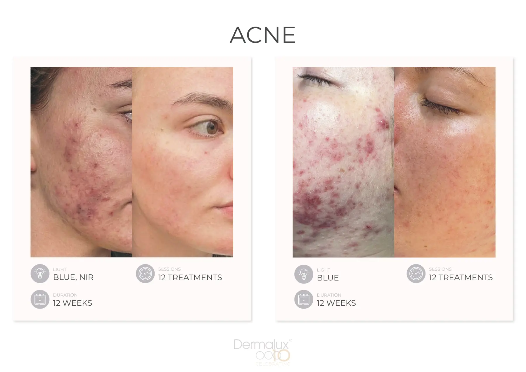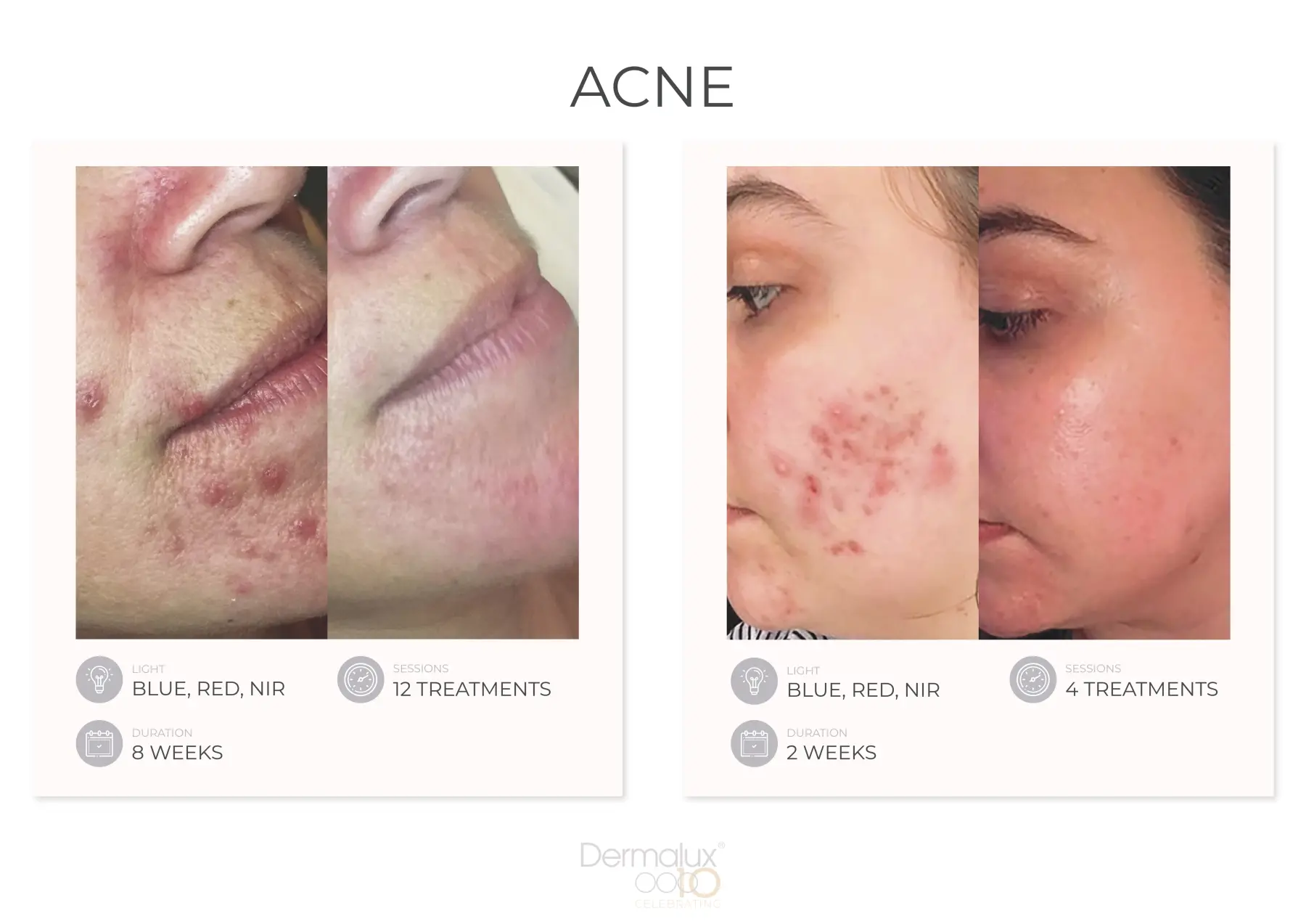 In Kombination mit Rot- und Nahinfrarotlicht bietet die Behandlung verbesserte Ergebnisse bei Akne und eignet sich hervorragend als Nachbehandlung, um Ausbrüche zu minimieren und Rötungen und Pickelmale zu reduzieren.
