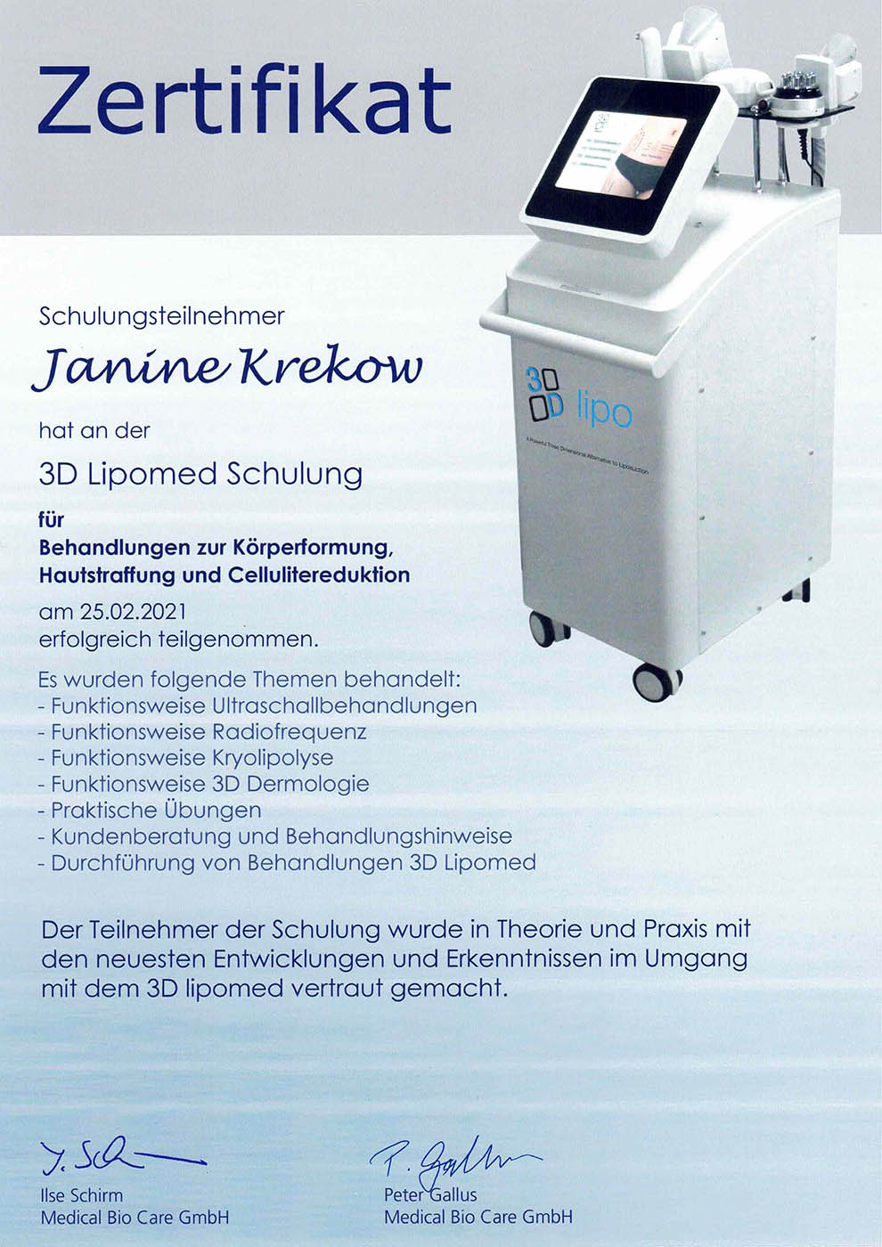 Frau Krekow ist eine sehr freundliche Person, die ihre Arbeit sehr gut und professionell macht. Der Behandlungsraum ist sehr schön eingerichtet, so dass die Atmosphäre sehr entspannt wirkt. Ich habe bei ihr im letzten Jahr mit dauerhafter Haarentfernung mit Pulslicht angefangen. Obwohl ich am Anfang sehr skeptisch war, bin ich jetzt vollauf begeistert, denn die Ergebnisse sind offensichtlich: meine Haut sieht super glatt aus, die Haare sind weg und als Mutter eines Kleinkindes kann ich mir sehr viel Zeit im Bad sparen.